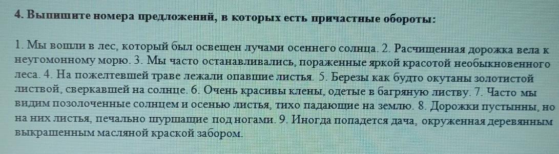 4. Выпишите номера предложений, в которых есть причастные обороты: