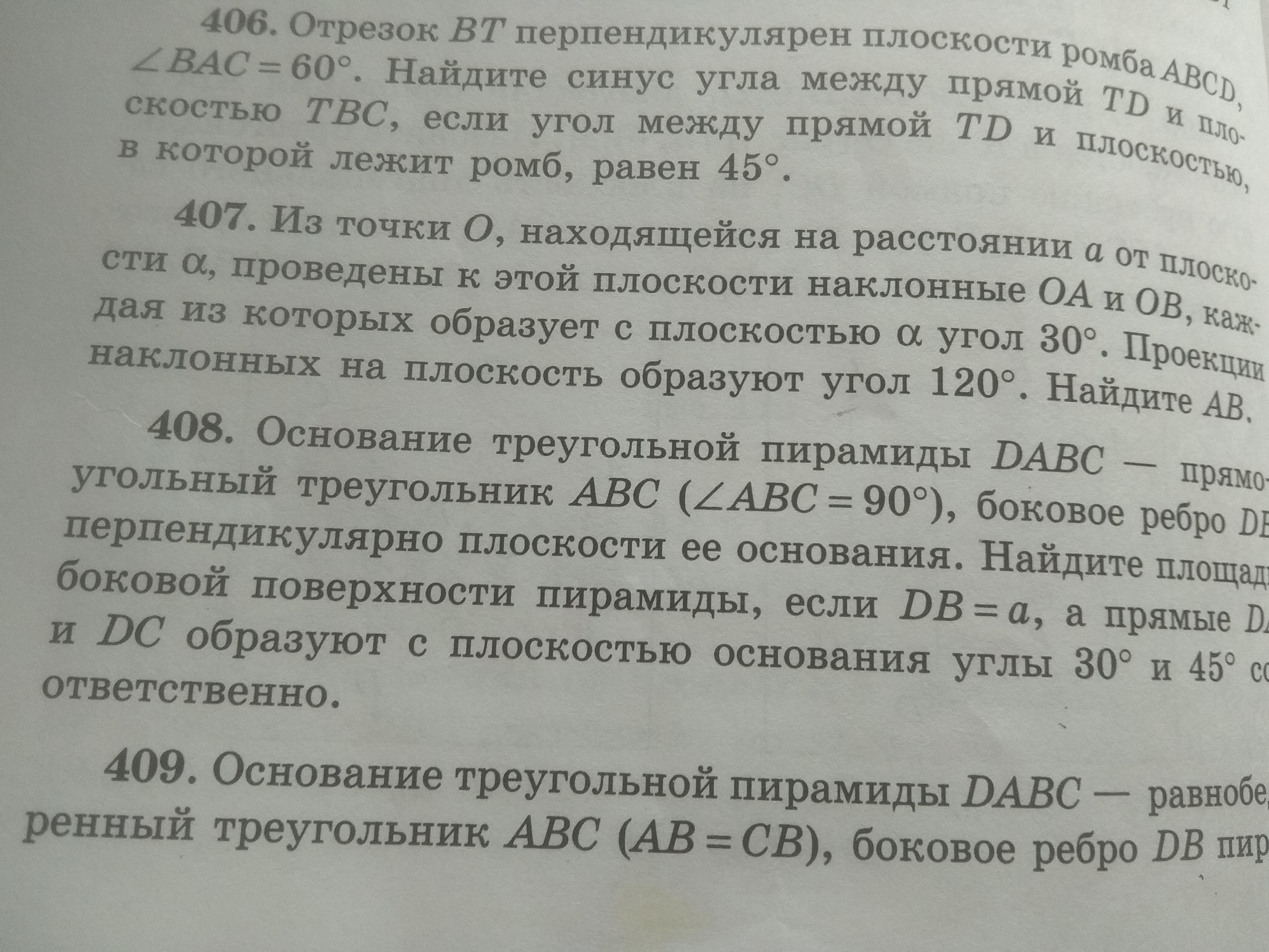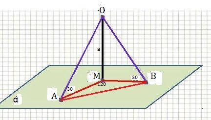 Если ОМ –расстояние, то ОМ⊥α ОМ=а. Т.к. наклонные образуют с плоскостью α углы 30, то ∠ОАМ=∠ОВМ=30.