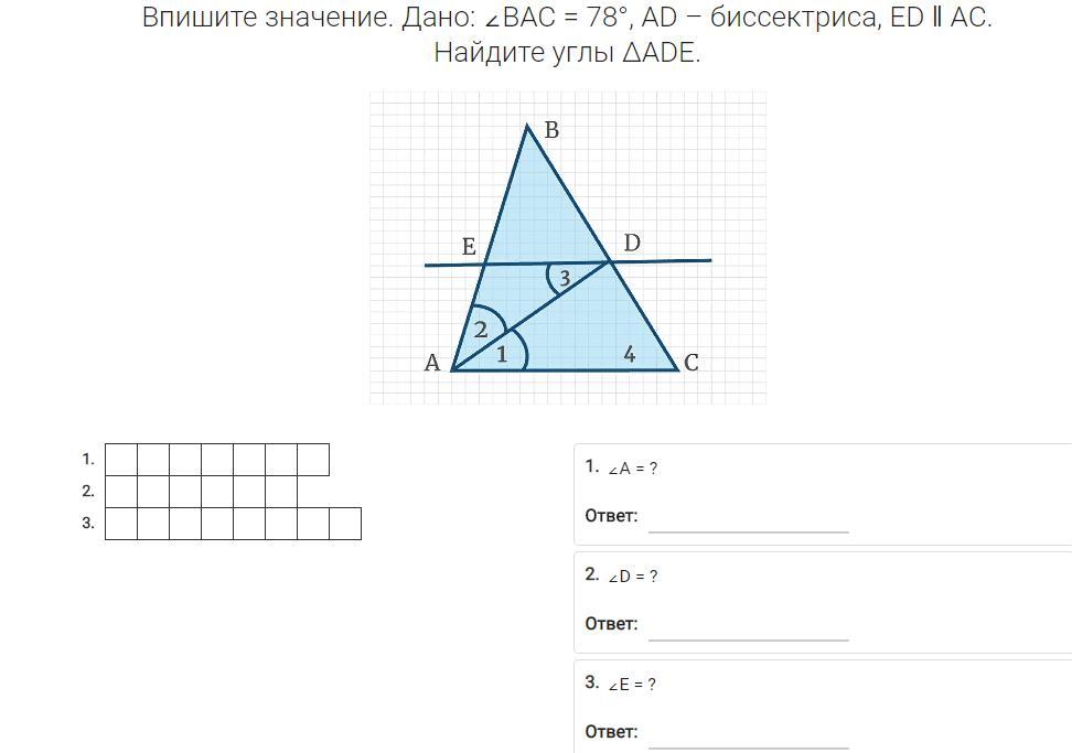 угол А (2)= 78°:2(биссектриса)=39°