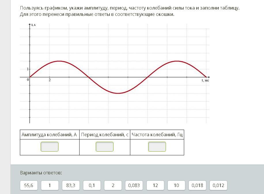 Пользуясь графиком, укажи амплитуду, период, частоту колебаний силы тока и заполни таблицу.