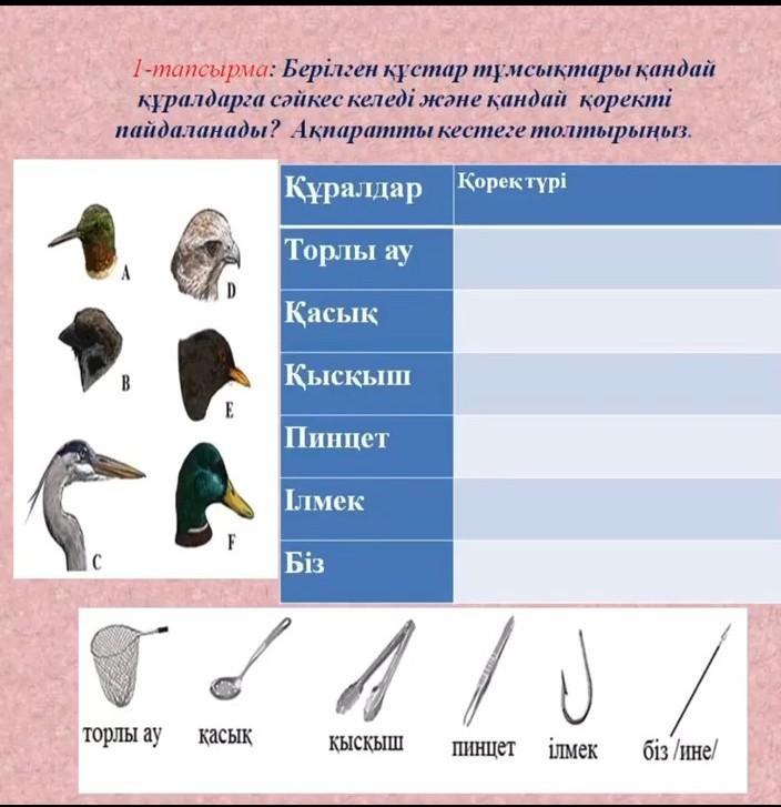берілген құстар тұмсықтары қандай құралдарға сәйкес келеді​