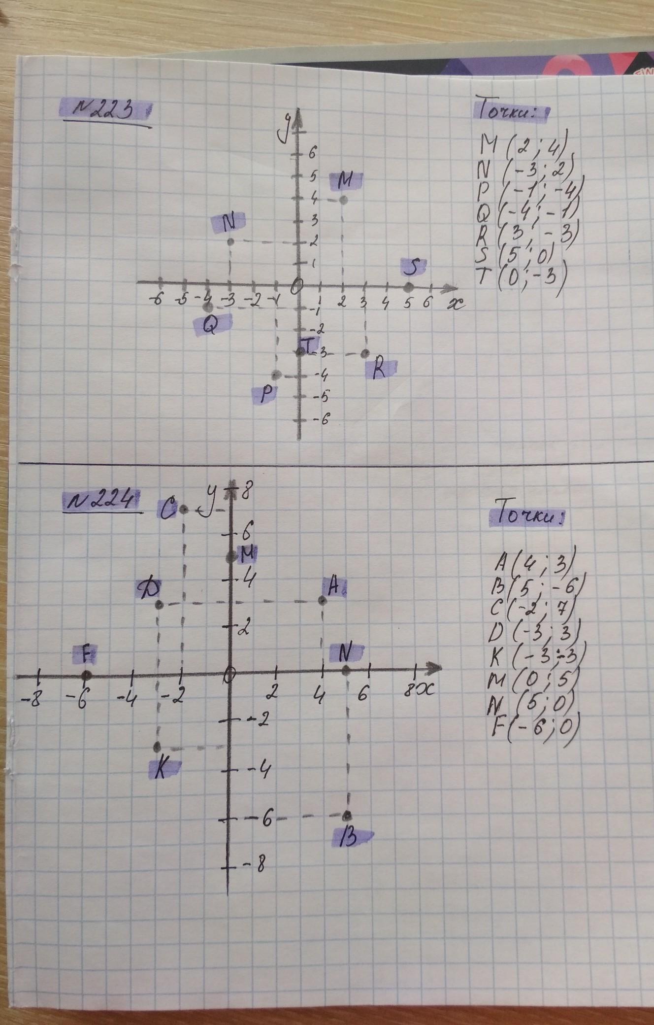 223. Найдите координаты точек M, N, N, P, Q, R, S, T, Т, изобра- жённых на 11. Рис. 11 224. Отметьте на координатной плоскости точки A (4; 3), B (5; -6), C(-2; 7), D (-3; 3), K(-3; -3), M (0; 5), N(5; 0), F(-6; 0). 225. Начертите на ко