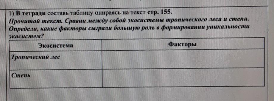 тетради составить таблицу опираясь на текст страница 155 Прочитай текст Сравни между собой экосистемы тропического леса и степи Определи Какие факторы сыграли большую роль в формировании уникальности экосистем ?