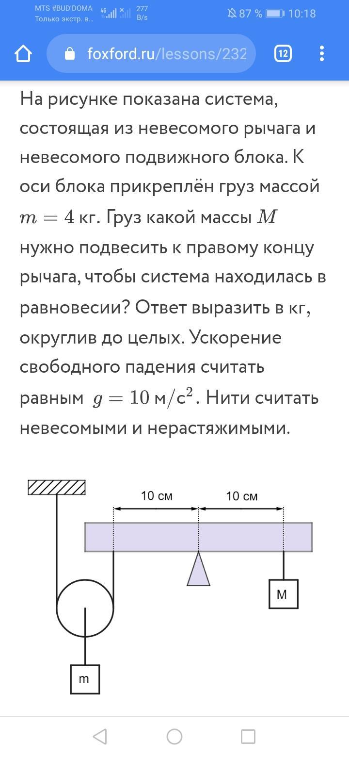 На рисунке показана система, состоящая из невесомого рычага и невесомого подвижного блока. К оси блока прикреплён груз массой 4 кг