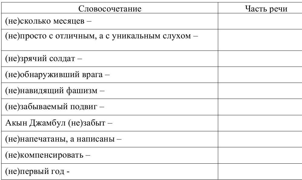 Ответ:несколько месяцев,не просто сотличным,а с уникальным слухом,незрячий солдат,не обнаруживший врага, ненавидящий фашизм, незабываемый подвиг, Акын Джамбул не забыт,не напечатаны,а написаны,не компенсировать, не первый год
