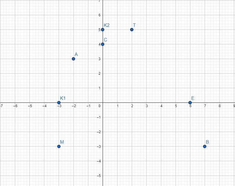 1. На координатной плоскости отметьте точки А(-2;3), В(7;-3), С(0;4), К(-3;0); М(-3;-3), Т(2;5), Е(6;0), К(0;-5) 2. С помощью чертежа найдите координаты точек пересечения отрезка АВ с осями координат, если А(2; 7), В(-3; -5)