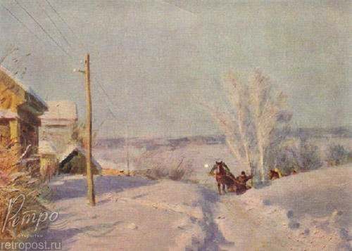 "На картине В. Г. Цыплакова "Мороз и солнце" изображена окраина села. На переднем плане этой картины изображена зимняя дорога, линия электропередач и угол дома некого помещика. Правее, двое саней запряжённые лошадьми, которые едут на другую окраину села, там же высокие берёзы, прикрывающие заснеженными ветками линию горизонта. Так же видна синеющая полоска леса, отделяющая небо от земли. Судя по теням, отбрасываемым кустом на переднем плане и домом, то на исходе вторая половина дня.