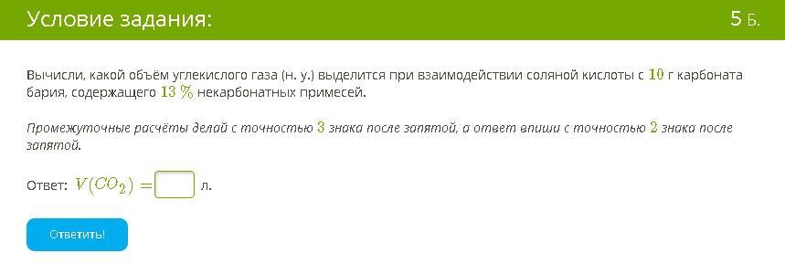 Вычисли, какой объём углекислого газа (н. у.) выделится при взаимодействии соляной кислоты с 10 г карбоната бария, содержащего 13 % некарбонатных примесей.