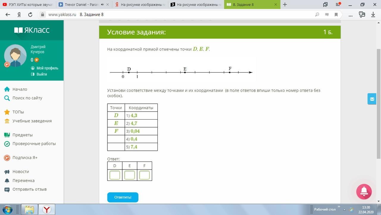 Установи соответствие между точками и их координатами (в поле ответов впиши только номер ответа без скобок).