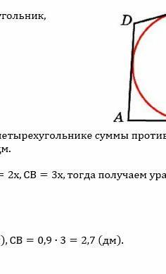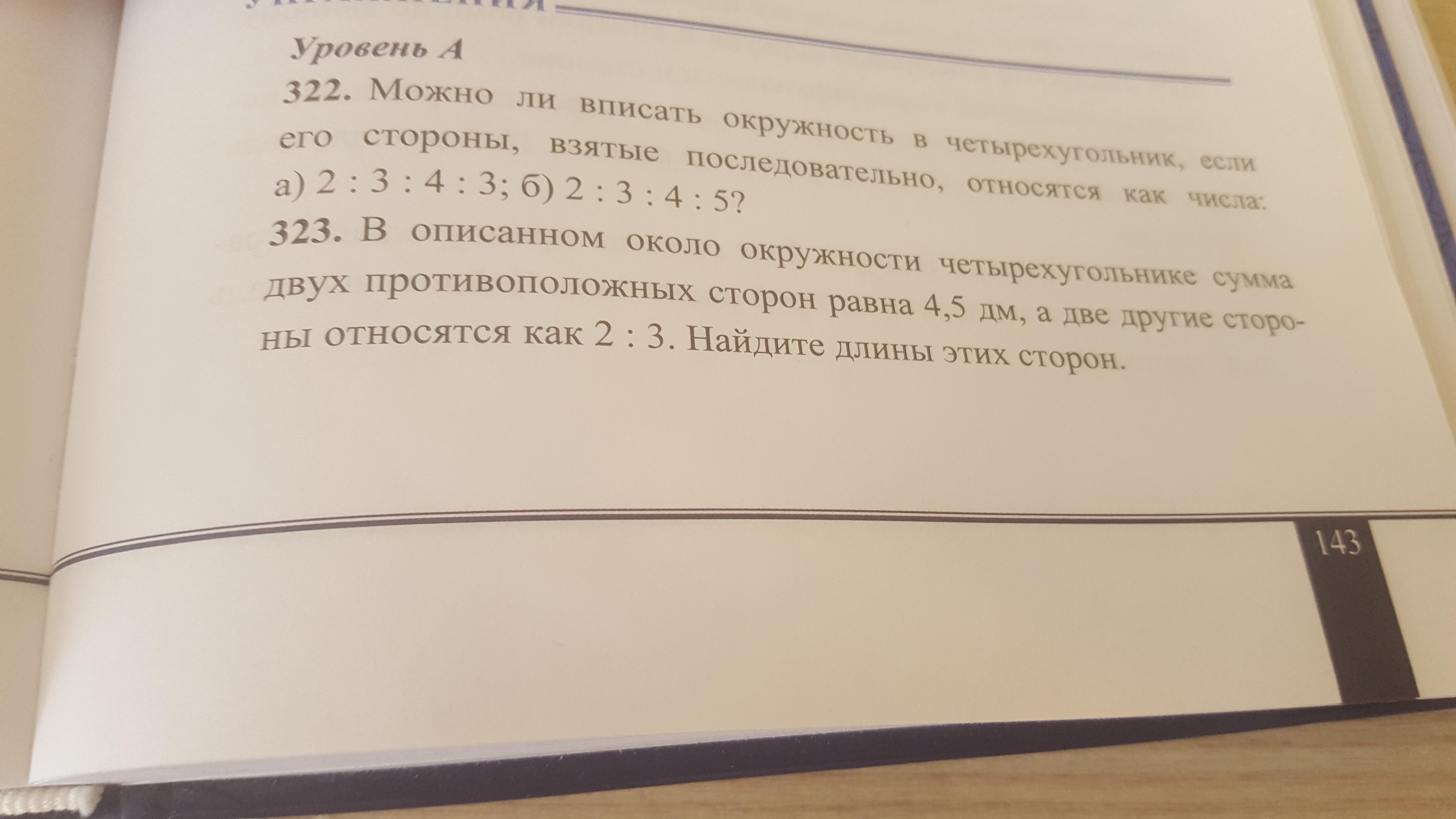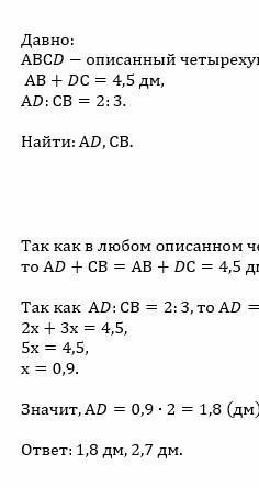 Задача 323: В описанном около окружности четырехугольнике сумма двух противолежащих сторон равна 4,5 дм, а две другие стороны относятся как 2:3. Найти длины этих сторон.