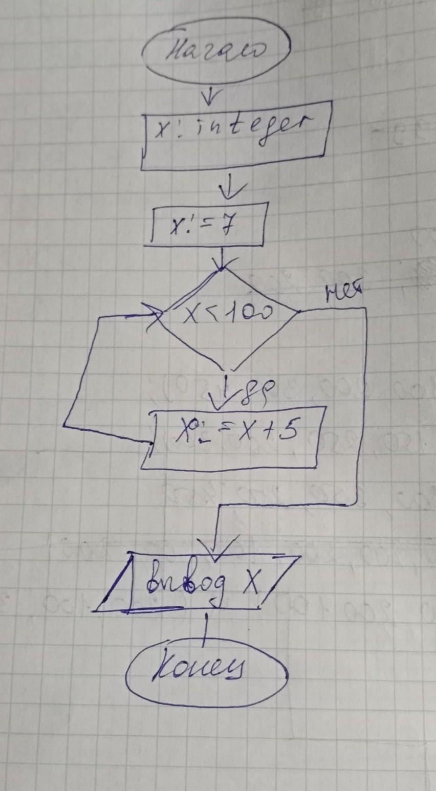 Составьте блок-схему алгоритма нахождения суммы чисел , первое из которых равно 7 , каждое следующее на 5 больше предыдущего все они не превышают 100 . Исполните алгоритм