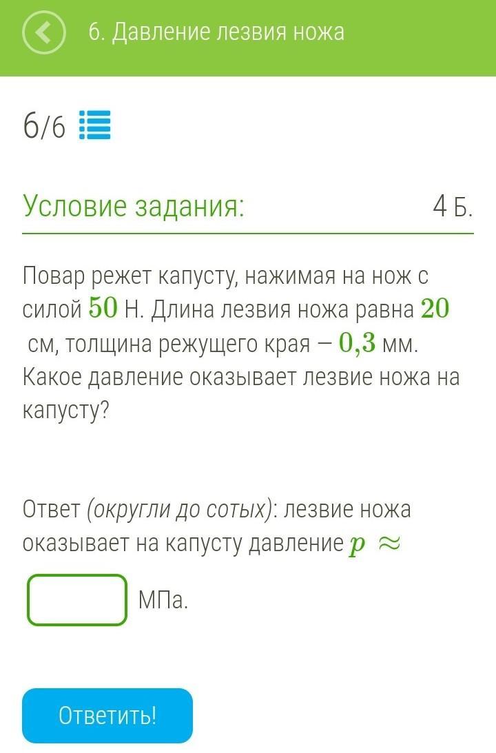 Ответ (округли до сотых): лезвие ножа оказывает на капусту давление p≈ МПа.