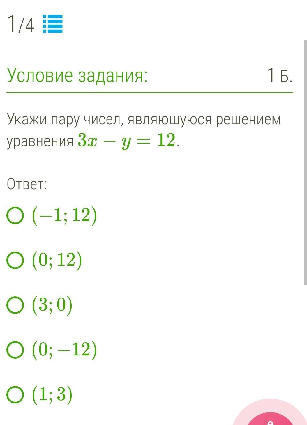 Правильный 4 т.к. при поставление 0 на х поулучается 3*0-у=12 где у=-12 удовлетворяет равенство