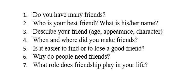1. Yes I have many friends 2. My best friend is (name )3. My friend is very fond of eating and very beautiful he is calm and he / she (years old )4. We became friends in the past year /or in this we pozdnokomilsya in school 5. Easier find than lose friend 6.That would ulybatsya ,laugh support 7.Very significant (я отметила где нужно про своего друга написать где (name ) его имя итд. Где в скобках и / вот таких местах ты сам напишешь .