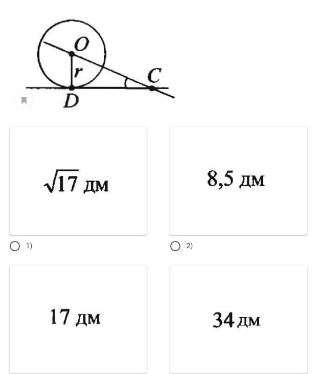 CD - касательная к окружности с центром в точке О. Найдите радиус окружности r, если известно, что CО = 17 дм, угол ОCD = 30 . *