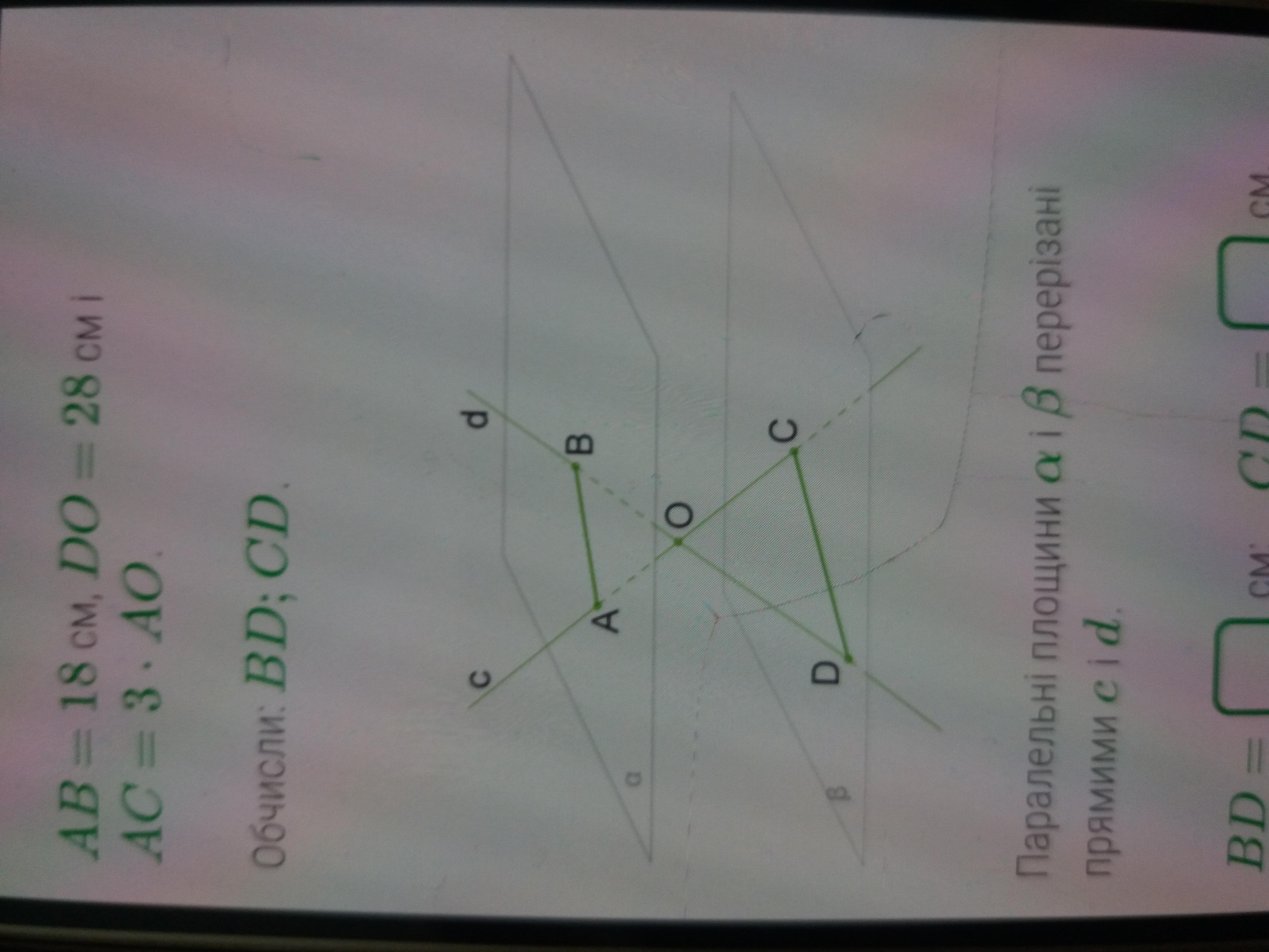 Через точку O, яка знаходиться між паралельними площинами a і ß, проведено прямі c і d, які перетинають площини так, що точки A і B знаходяться в площині a, а точки C і D - у площині ß.