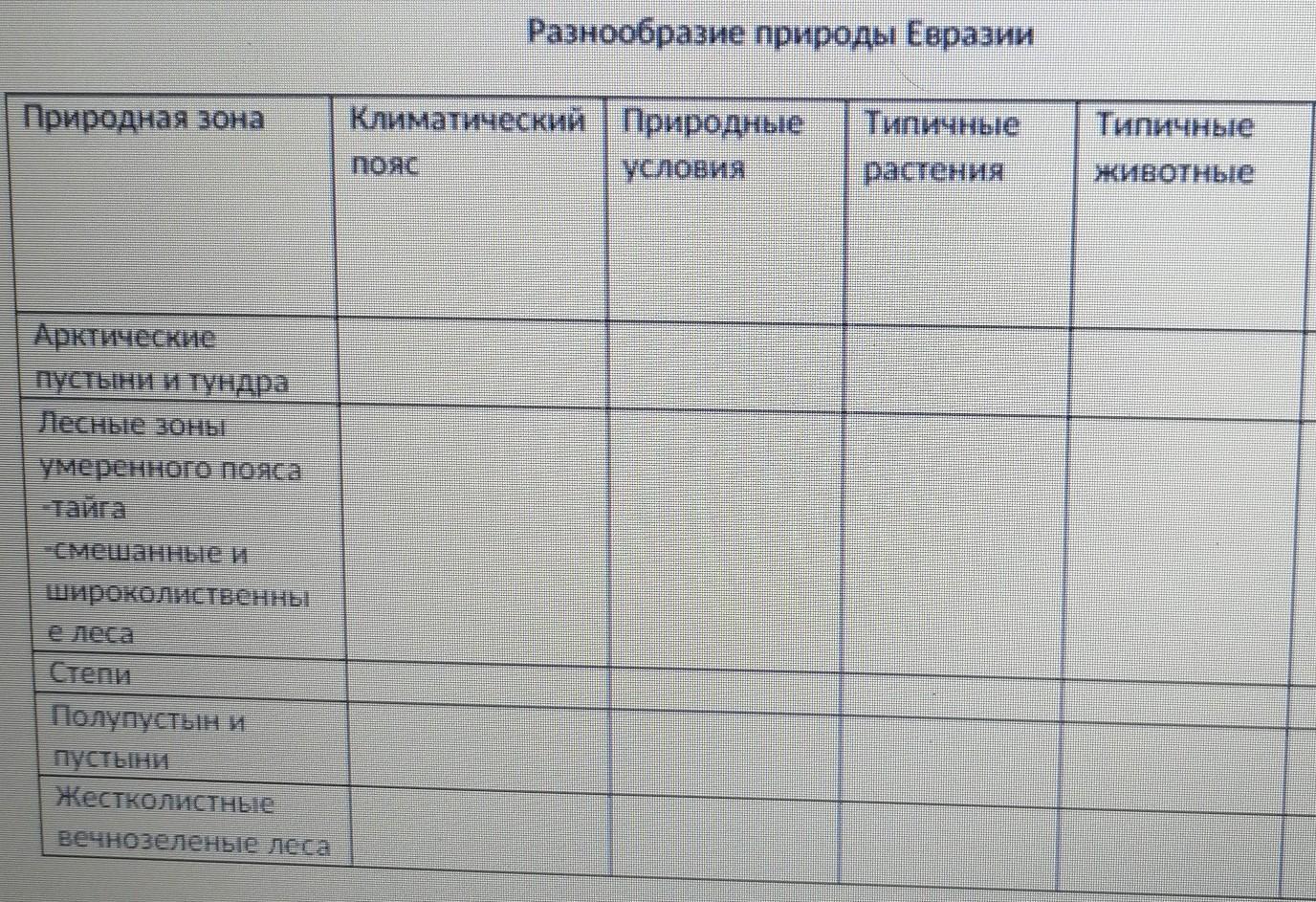 Таблица по географии: природная зона/климатический пояс/ природные условия/ типичные растения/ типичные животные/ изменения природы хозяйственной деятельностью человека.