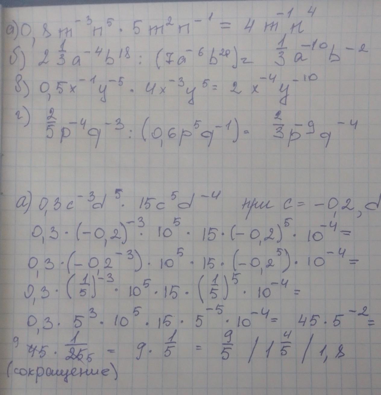 в первом номере ( 4 ) мы просто перемножаем числа, а степени над буквами при умножении складываем ( но учитывая знаки), а при делении их вычитаем.
