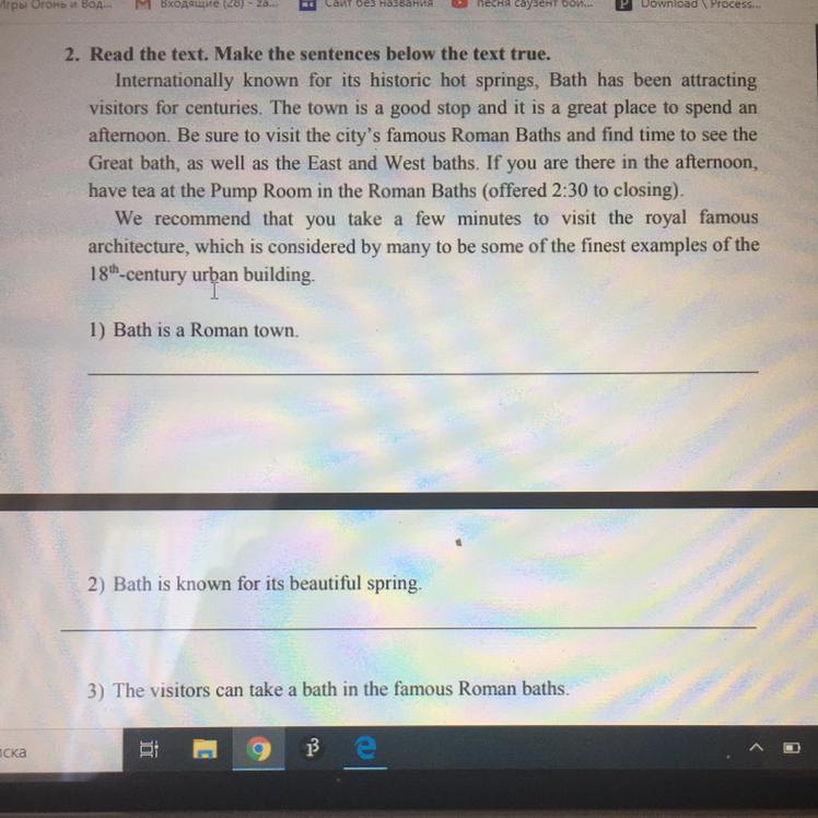 2. Прочитайте текст. Сделайте предложения ниже текста правдивыми. Всемирно известный своими историческими горячими источниками, Бат привлекает посетителей на протяжении веков. Город является хорошей остановкой, и это отличное место, чтобы провести послеобеденное время. Обязательно посетите знаменитые римские бани города и найдите время, чтобы увидеть Великие бани, а также восточные и западные бани. Если вы там во второй половине дня, попейте чай в Pump Room в римских банях (предлагается 2:30 до закрытия). Мы рекомендуем вам потратить несколько минут, чтобы посетить знаменитую королевскую архитектуру, которая, по мнению многих, является одним из лучших образцов городской застройки 18-го века.