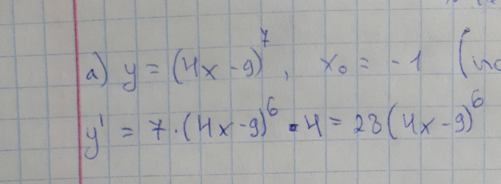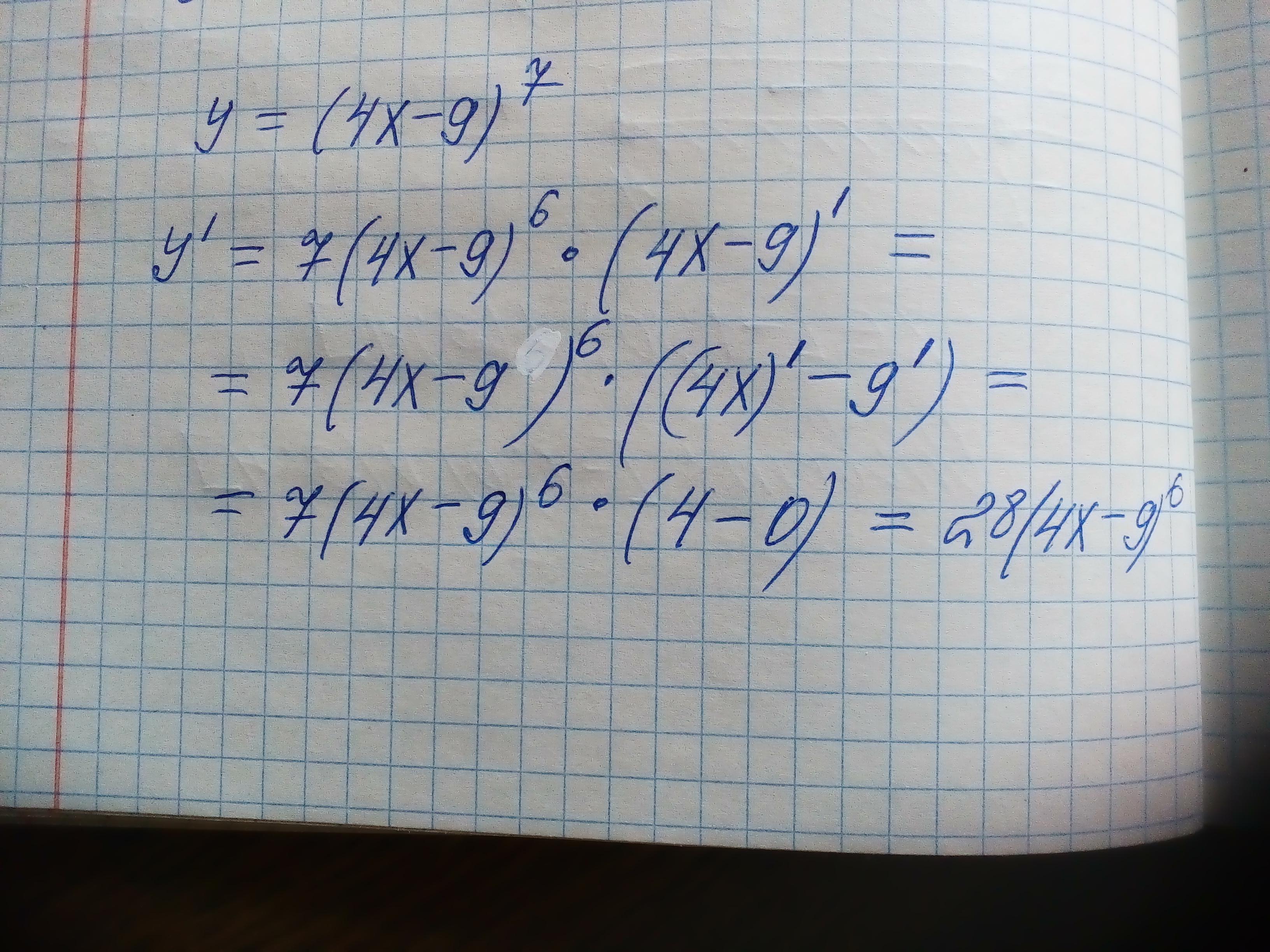 y'=[(4x-9)^7]'*(4x-9)]'=7*(4x-9)^6*(4x-9)'=7*(4x-9)^6*(4x'-9')=7*(4x-9)^6*(4-0)=