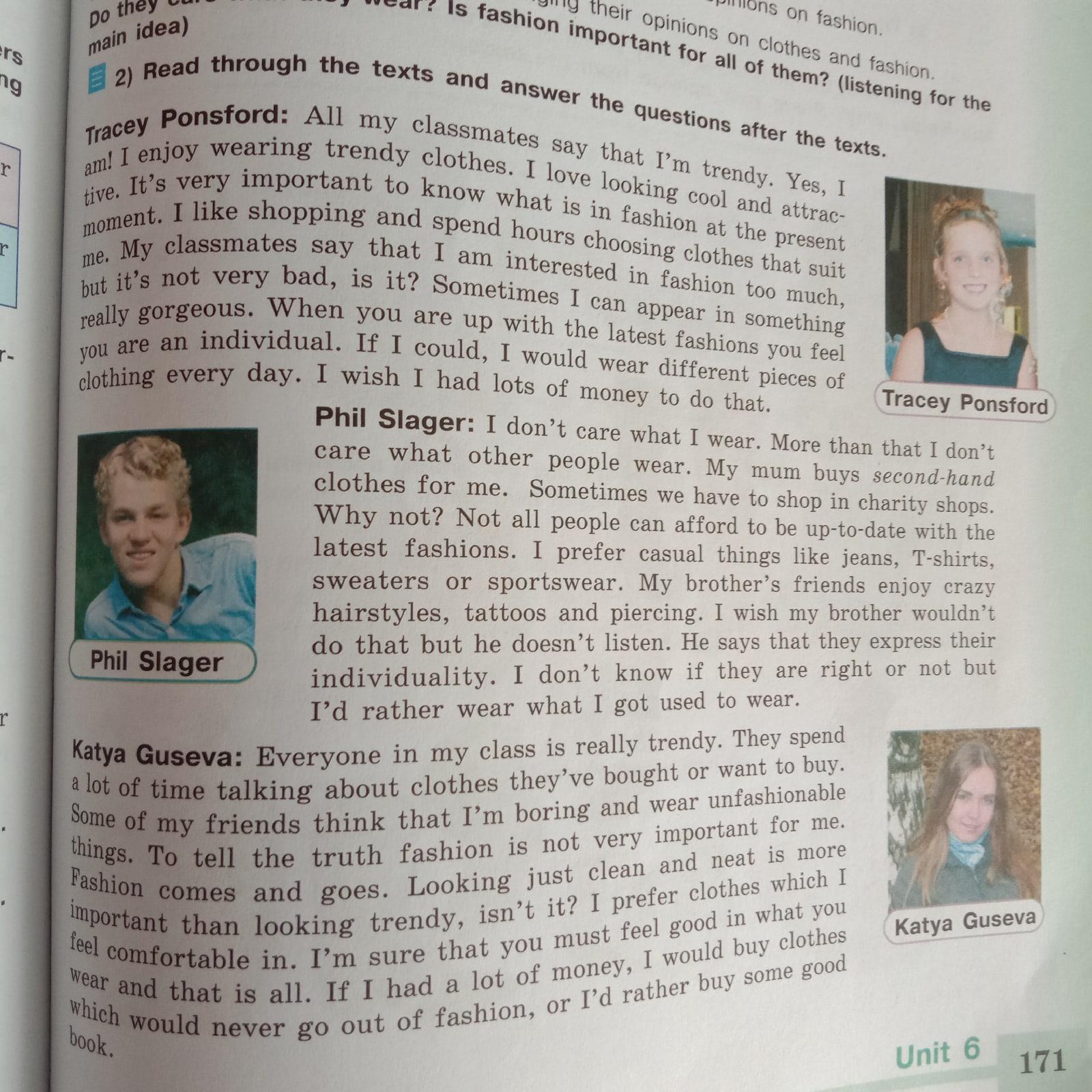 1) What do Tracey's classmates think about her attitude to clothes? 2) Why does Tracey think it's necessary to wear trendy clothes? 3) What is Phil's favourite type of clothes? 4) What do Katya's friends think about clothes she wears? 5) What is Katya's opinion about clothes?