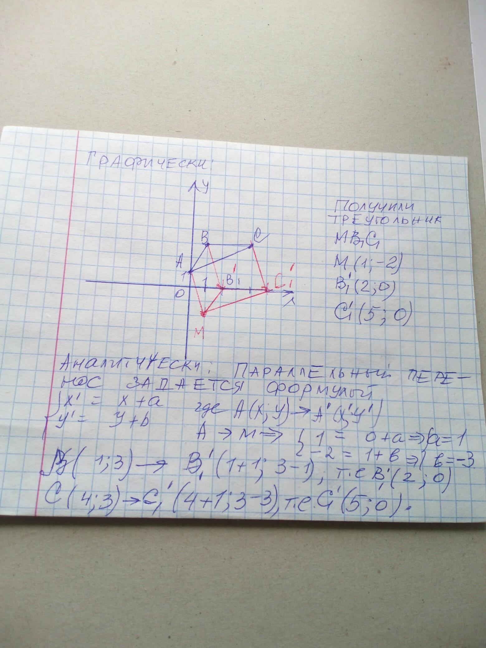 Вершини трикутника розташовані в точках A(0;1), B(1;3), C(4;3). Задайте паралельне перенесення, яке вершину А переводить у точку М(1;-2). Запишіть координати вершин отриманого трикутника.