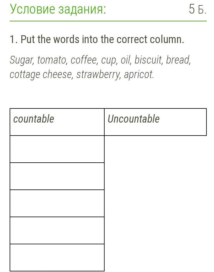 Uncountable: sugar, coffee, oil, biscuit, bread, cheese