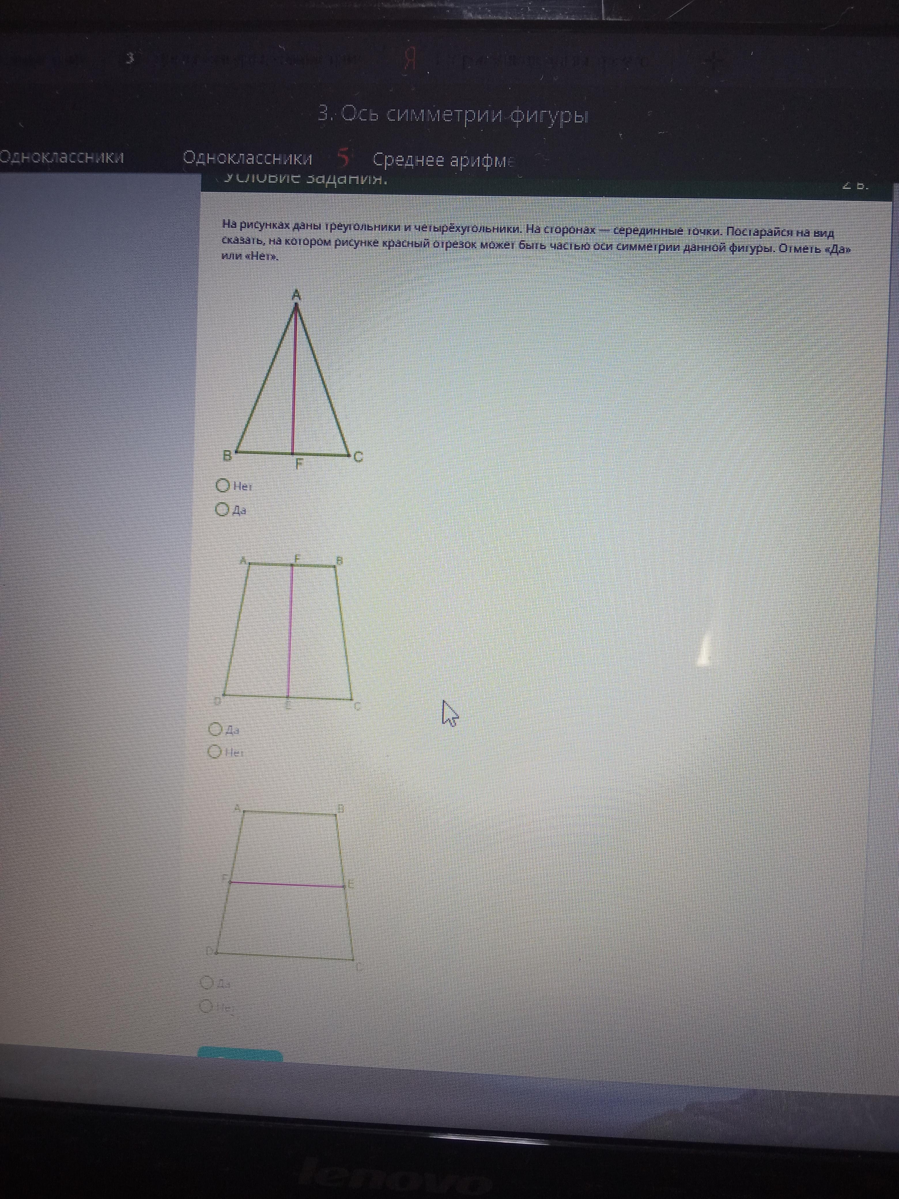 На рисунках даны треугольники и четырёхугольники. На сторонах — серединные точки. Постарайся на вид сказать, на котором рисунке красный отрезок может быть частью оси симметрии данной фигуры. Отметь «Да» или «Нет».