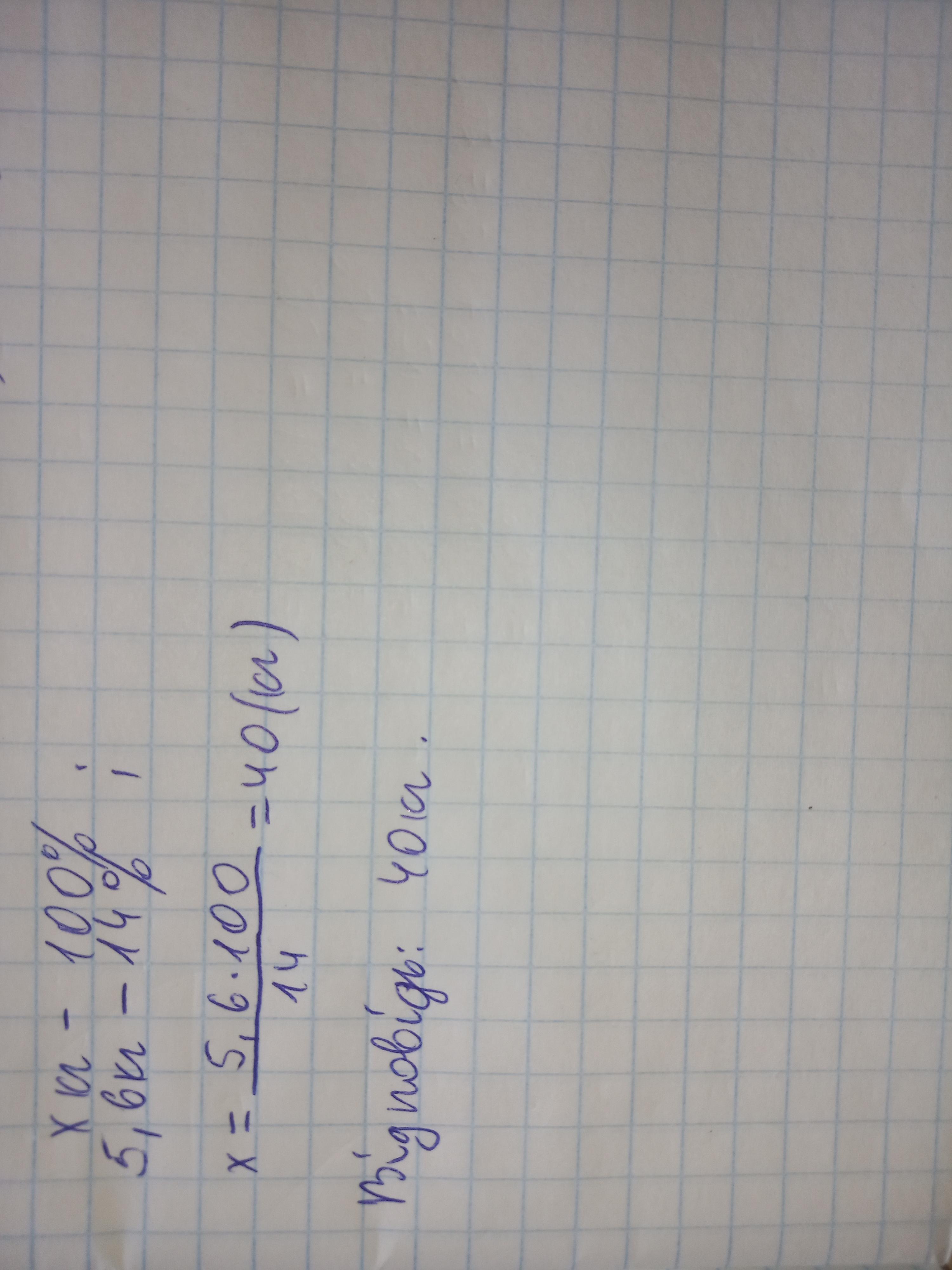 Маса сушоной картошки становить 14% маси свіжої.Сколько свежей картошки надо взять чтоб получить 5,6 кг сушоной?