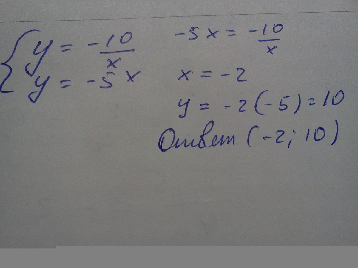На рисунке изображены гипербола y=-(10/x) и прямая y=-5x. Вычислите координаты точки С.