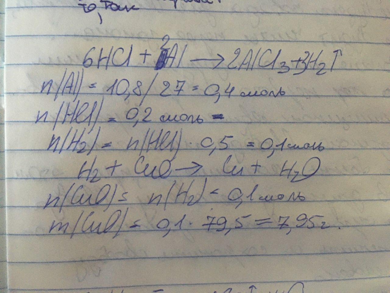 Какая масса оксида меди (II) восстановится водородом, выделившемся при взаимодействии 10,8 г алюминия с раствором соляной кислоты, массой 7,3 г?