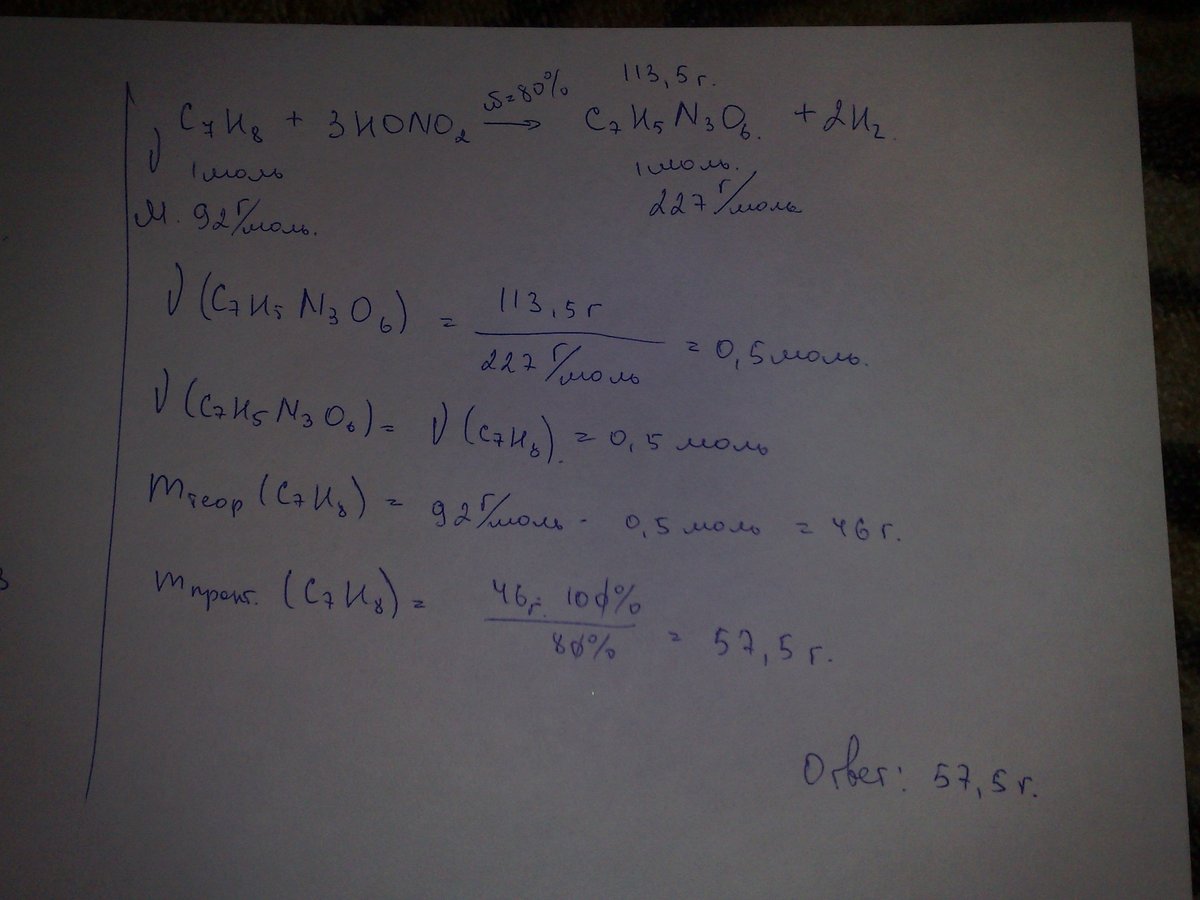Сколько граммов толуола потребуется для получения 113,5 г. тротила (тринитротолуола), если выход продукта реакции составляет 80% от теоретически возможного?