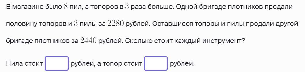 Думаю, что 1 пила стоит 80 рублей, а 1 топор 170 рублей