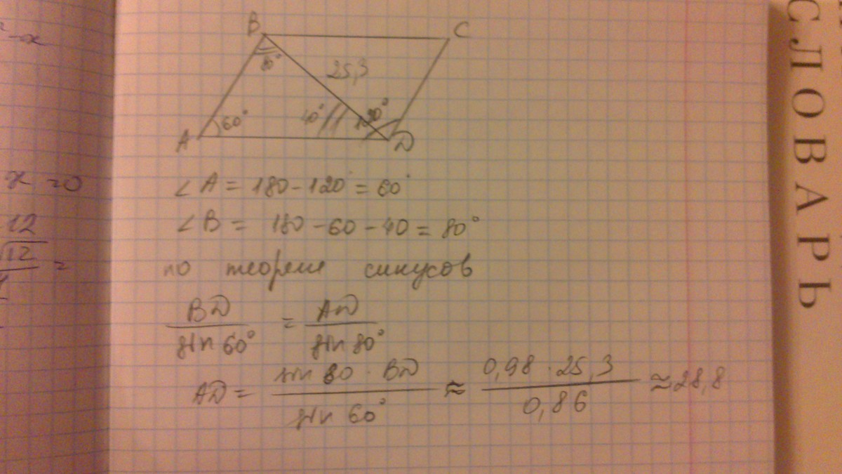 В параллелограмме ABCD уголD=120гр , , уголBDA =40гр , BD=25,3см . Вычислить большую сторону параллелограмма