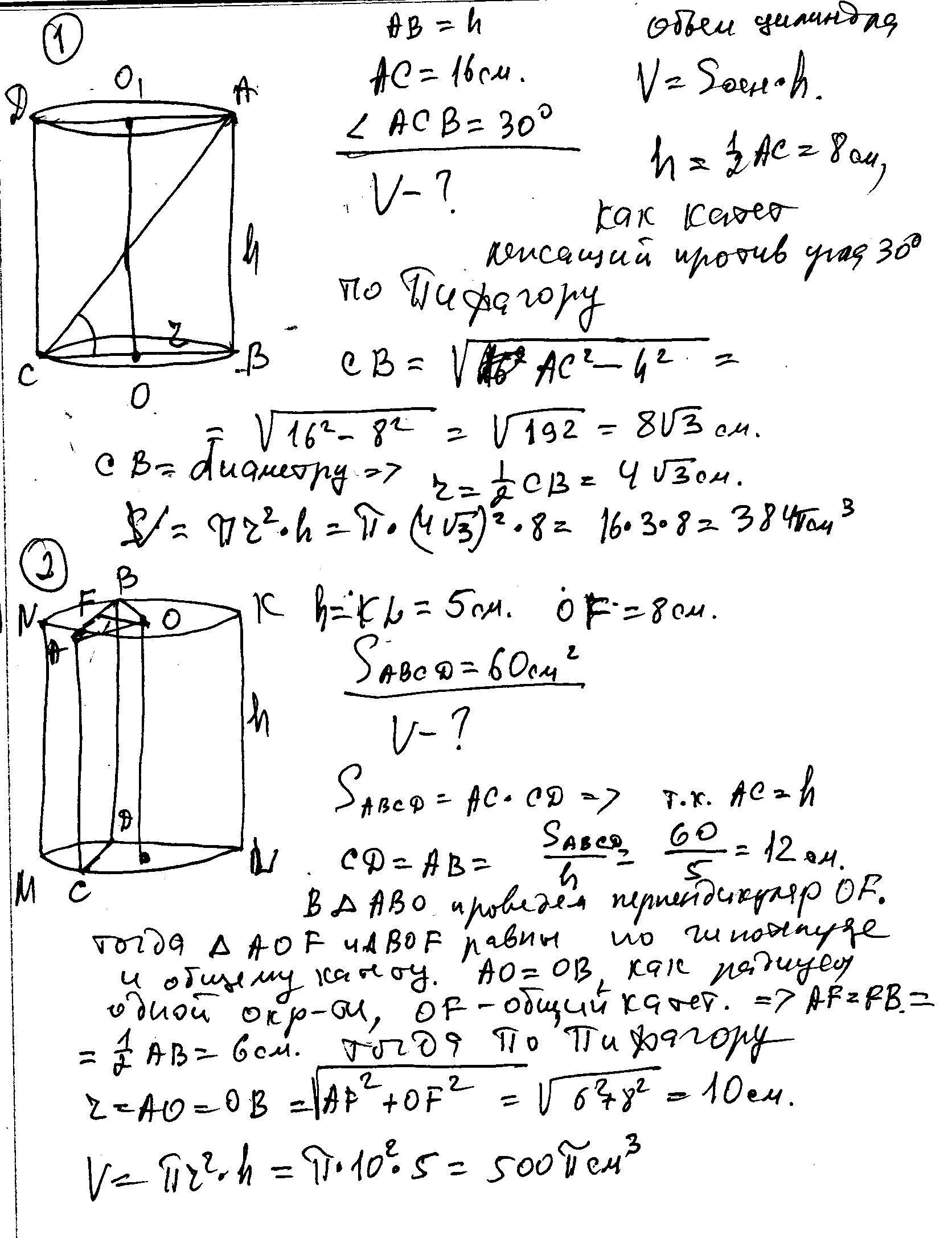 1.Диагональ осевого сечения цилиндра равна 16 см и наклонена к плоскости основания цилиндра под углом 30 градусов.Найдите объём цилиндра.