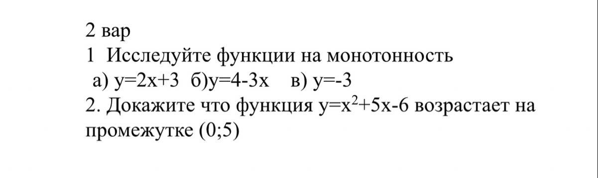1 Исследуйте функции на монотонность а) у-2х+3 б)у-4-3х в) у--3 2. Докажите что функция у-х*+5х-6 возрастает на промежутке (0;5). Помогите пожалуйста!!! Даю 20 баллов