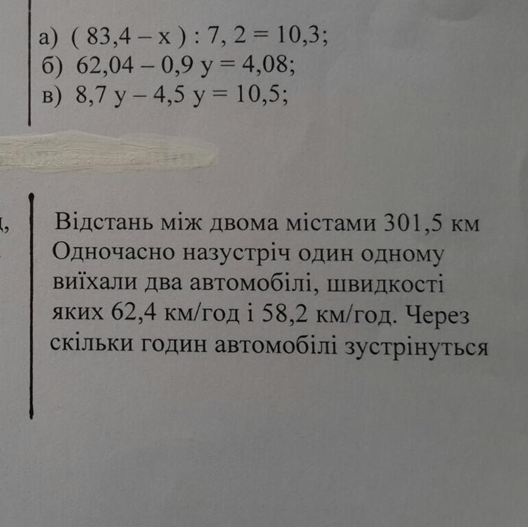 Расстояние между 2 городами 301,5 км Одновременно навстречу друг другу выехали два автомобиля, скорости которых 62,4 км / ч и 58,2 км / год.Через сколько часов автомобили встретятся?