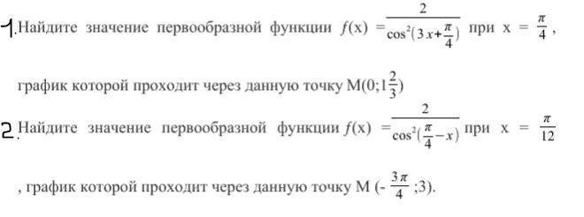 Найдите значение первообразной функции ƒ(x) =2/cos(3 x+ π/4 ) при x =