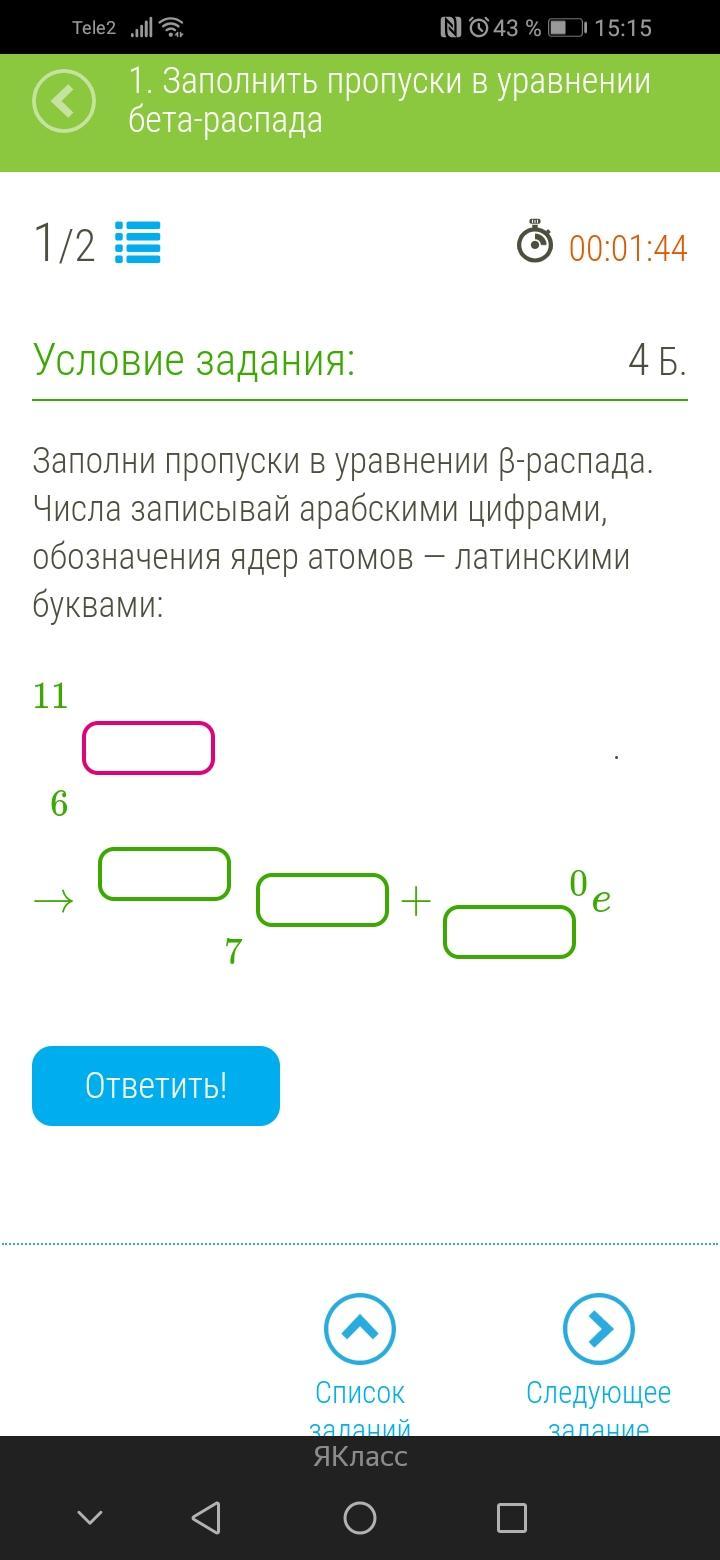 1.Заполни пропуски в уравнении В-распада. Числа записывай арабскими цифрами, обозначения ядер атомов - латинскими буквами