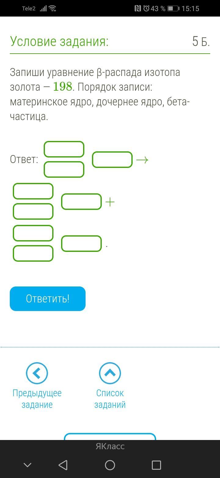 2.Запиши уравнение В-распада изотопа золота - 198. Порядок записи: материнское ядро, дочернее ядро, бета- частица.