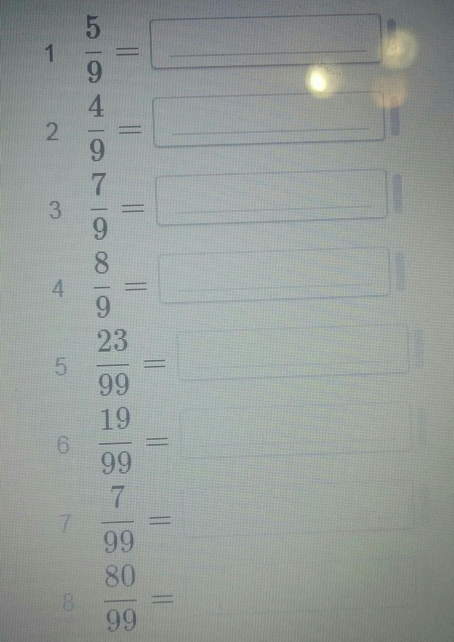 Просто пишешь числа которые сверху, и в зависимости от того что снизу то есть если в знаменателе 9 то 0,(x) если 99 то 0,(xx) и так далее