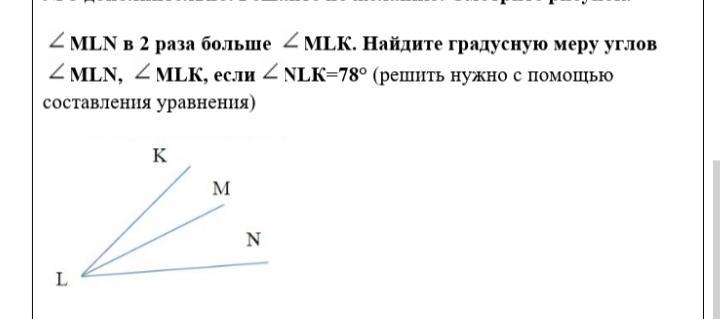 пусть х° - ∠MLK, тогда ∠MLN = (2х)°. Известно, что ∠NLK = 78°.