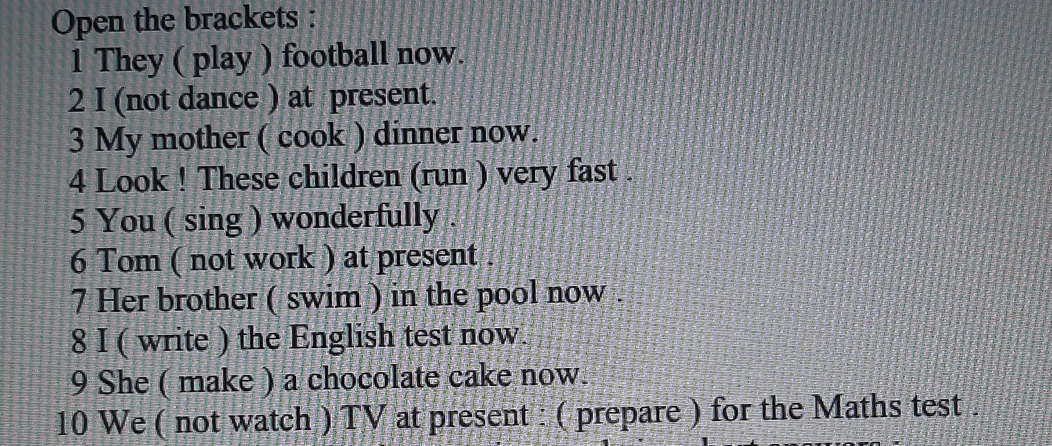 playing/ dont dance/ is cooking/ is running/ sing/ doesnnt work/ is swimming/ am writing/ is makeing/ не знаю последнее