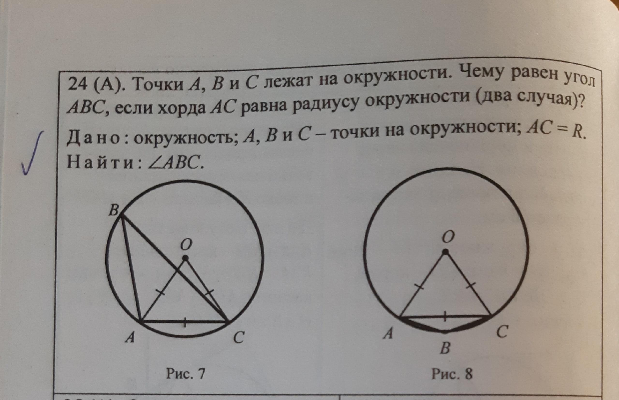 24 (A). Точки А, В и С лежат на окружности. Чему равен угол АВС, если хорда АС равна радиусу окружности (два случая)?