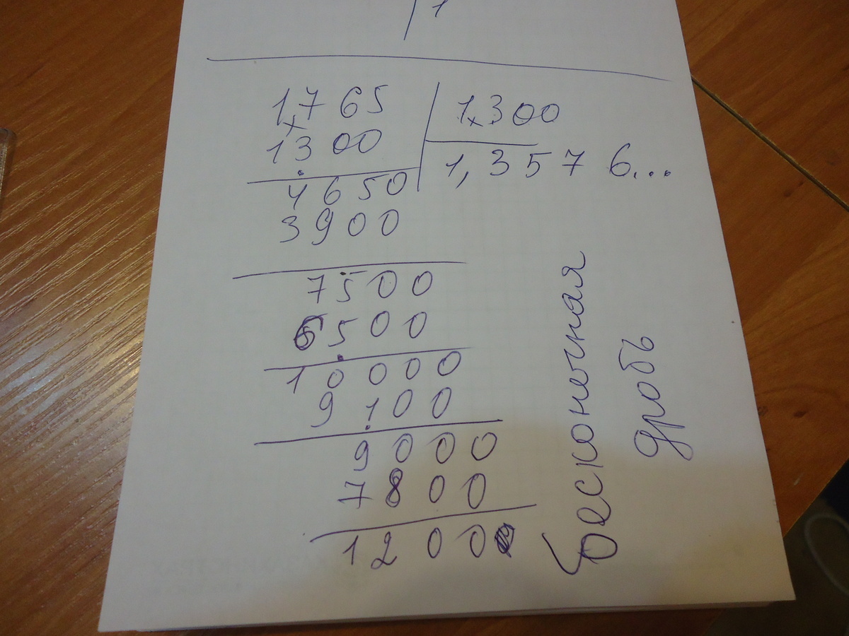 В делимом переносим запятую на три разряда вправо(получим 1765, в делители переносим на такое же количество знаков вправо, для этого нужно дописать еще 2 нуля(получим 1300) Делим 1765 на 1300, берем по 1, от 1765 отнимаем 1300, остается 465, дописываем 0, теперь 4650:1300,берем по 3,