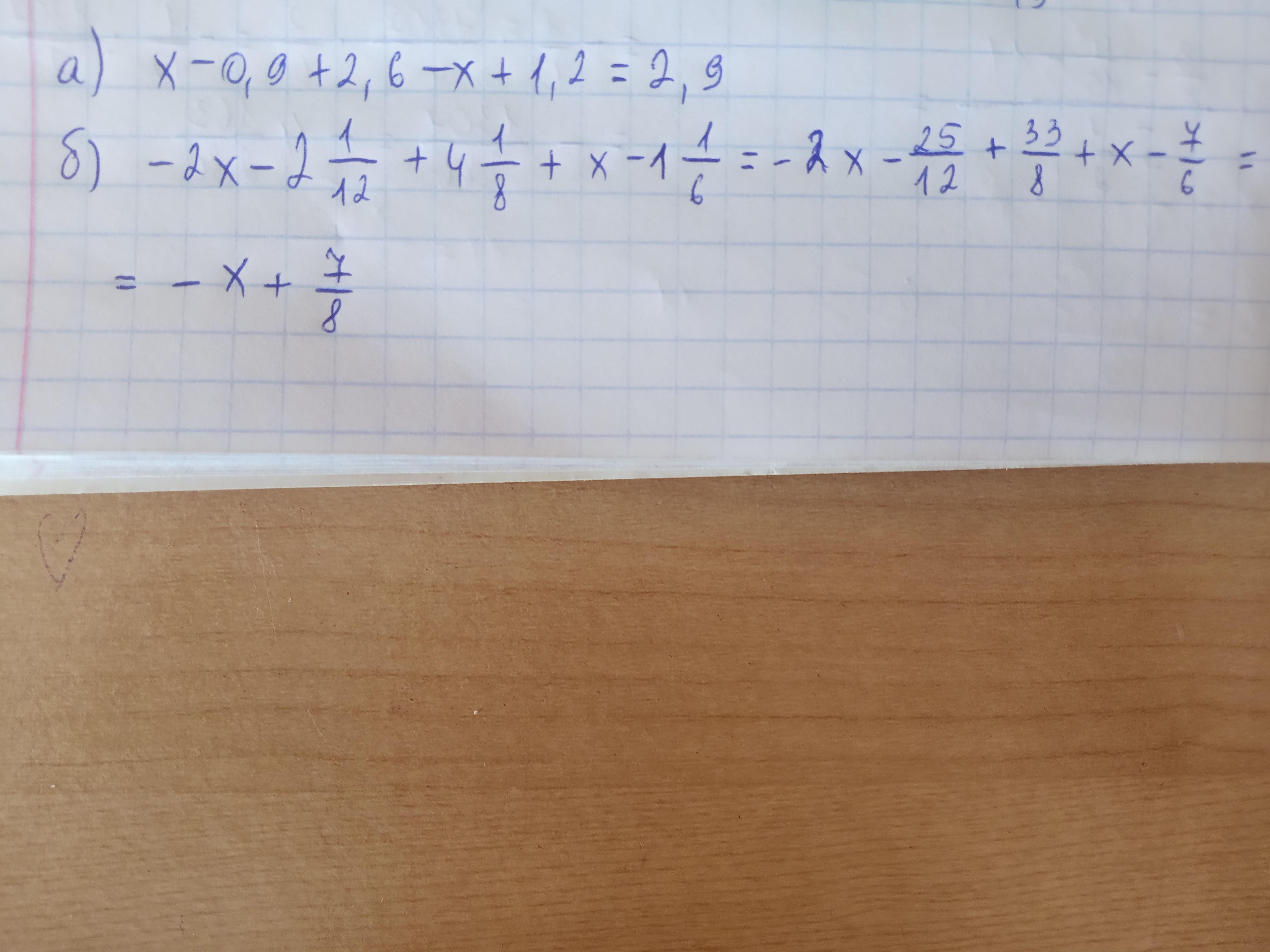 упростите выражение а) x-0,9+2,6-x+1,2 б) - 2x-2 целых 1/12+4 целых 1/8+x-1 целая 1/6 пожалуйста помогите!