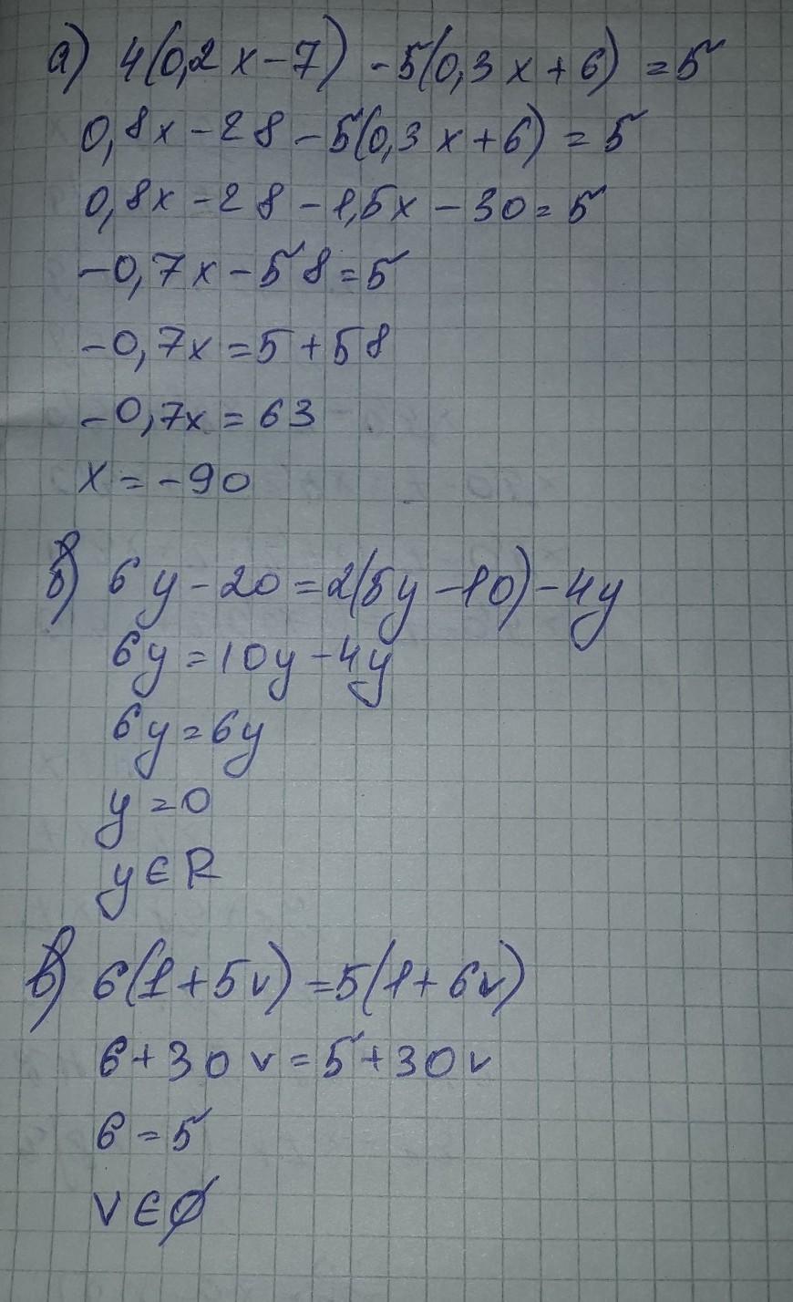 а) 4(0,2x – 7) – 5(0,3x + 6) = 5;