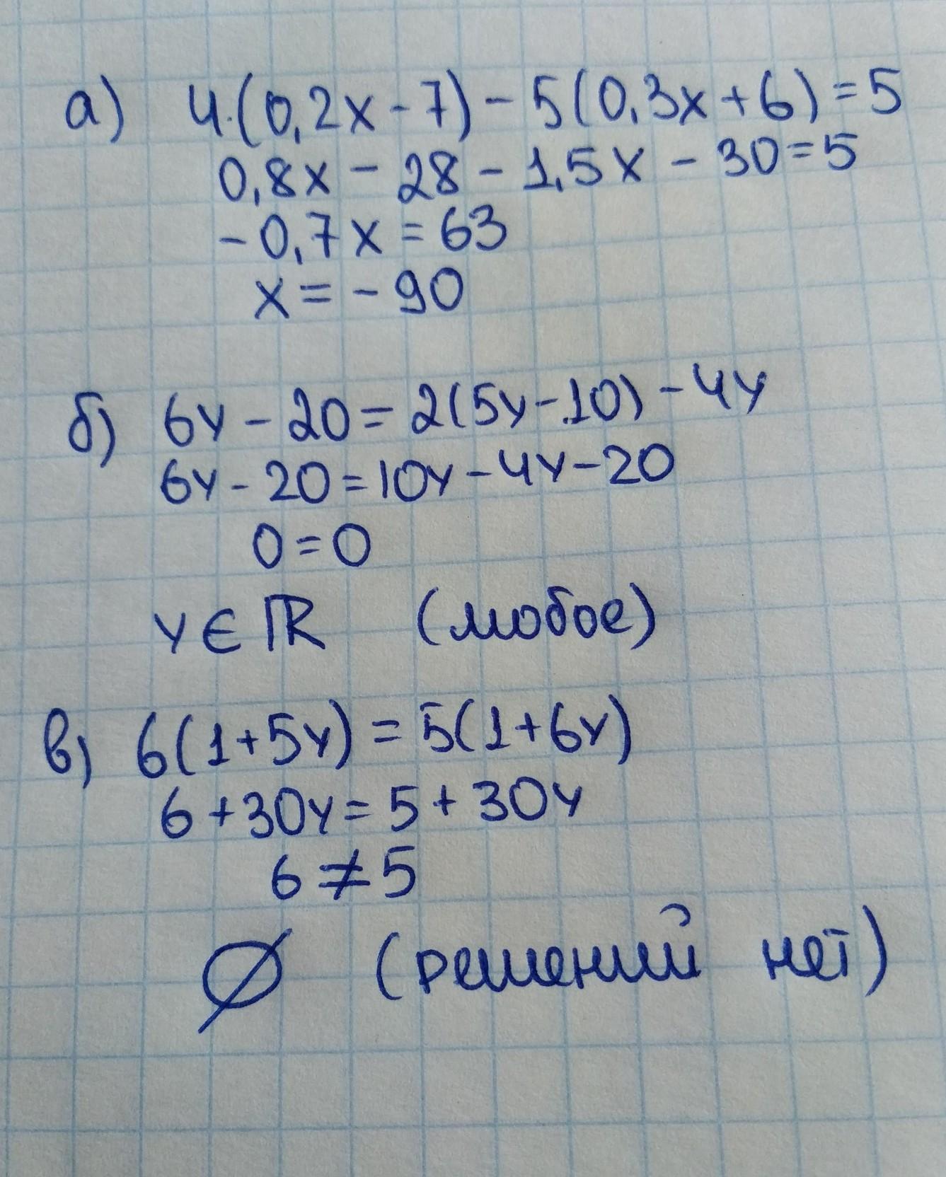 а) 4(0,2x – 7) – 5(0,3x + 6) = 5;