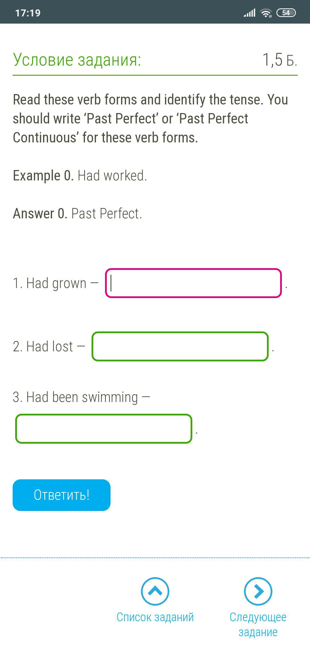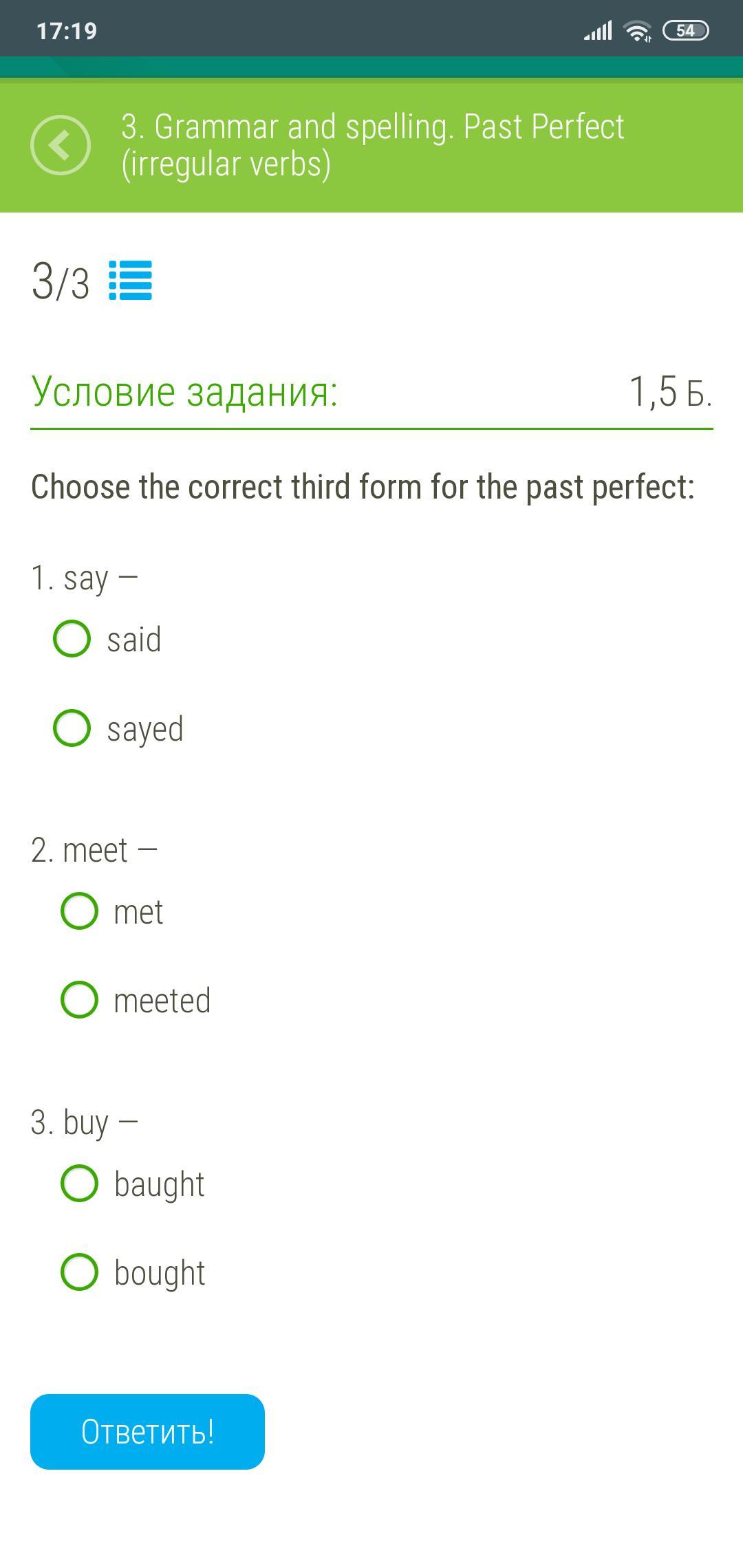 Past Perfect образуется при помощи второй формы глагола to have — had и третьей формы смыслового глагола (Past Participle). Третья форма правильных глаголов образуется с помощью окончания –ed, а для неправильных см. Неправильные глаголы. (Прикрепляю таблицу)