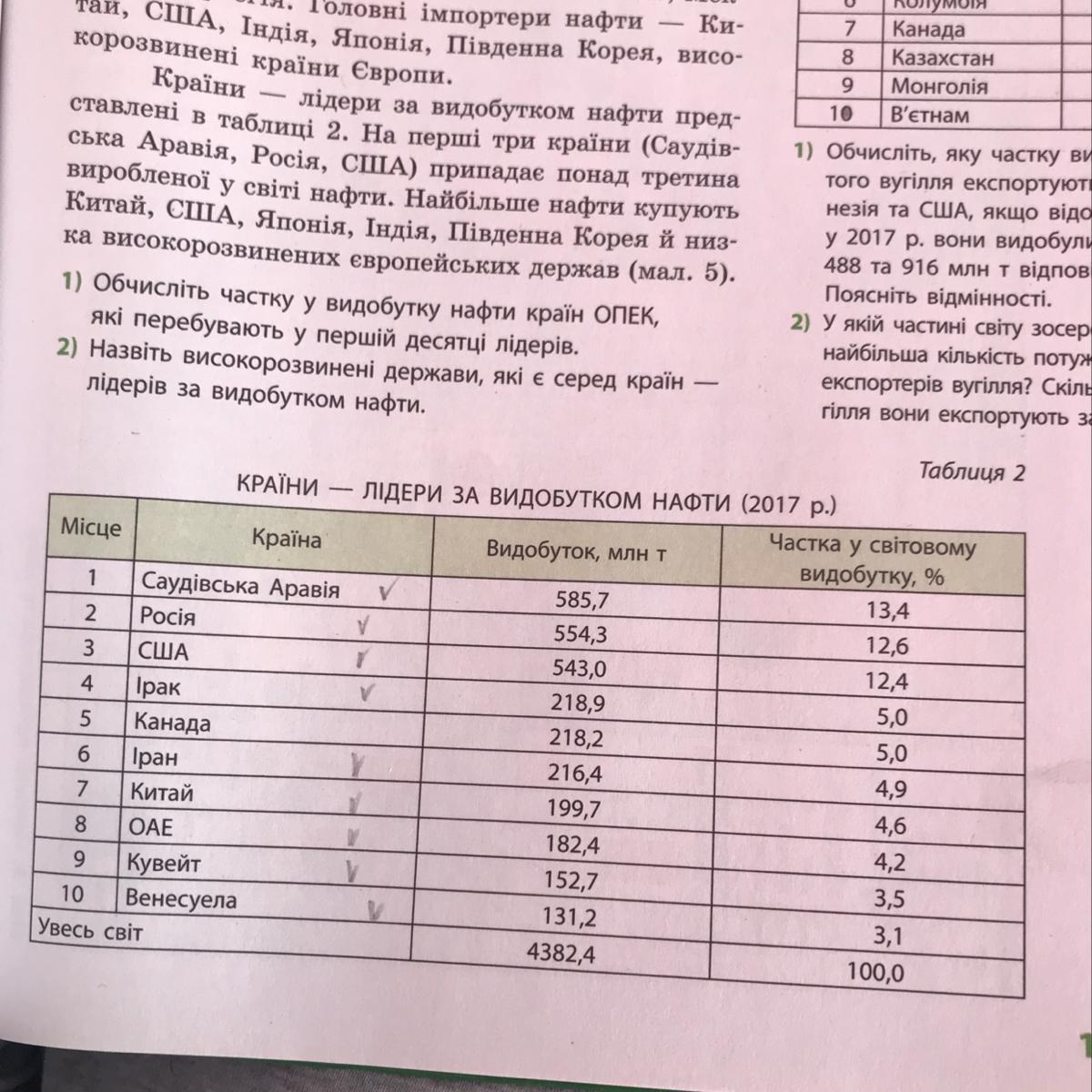 Обчисліть частку у видобутку нафти країн ОПЕК, які перебувають у першій десятці лідерів.